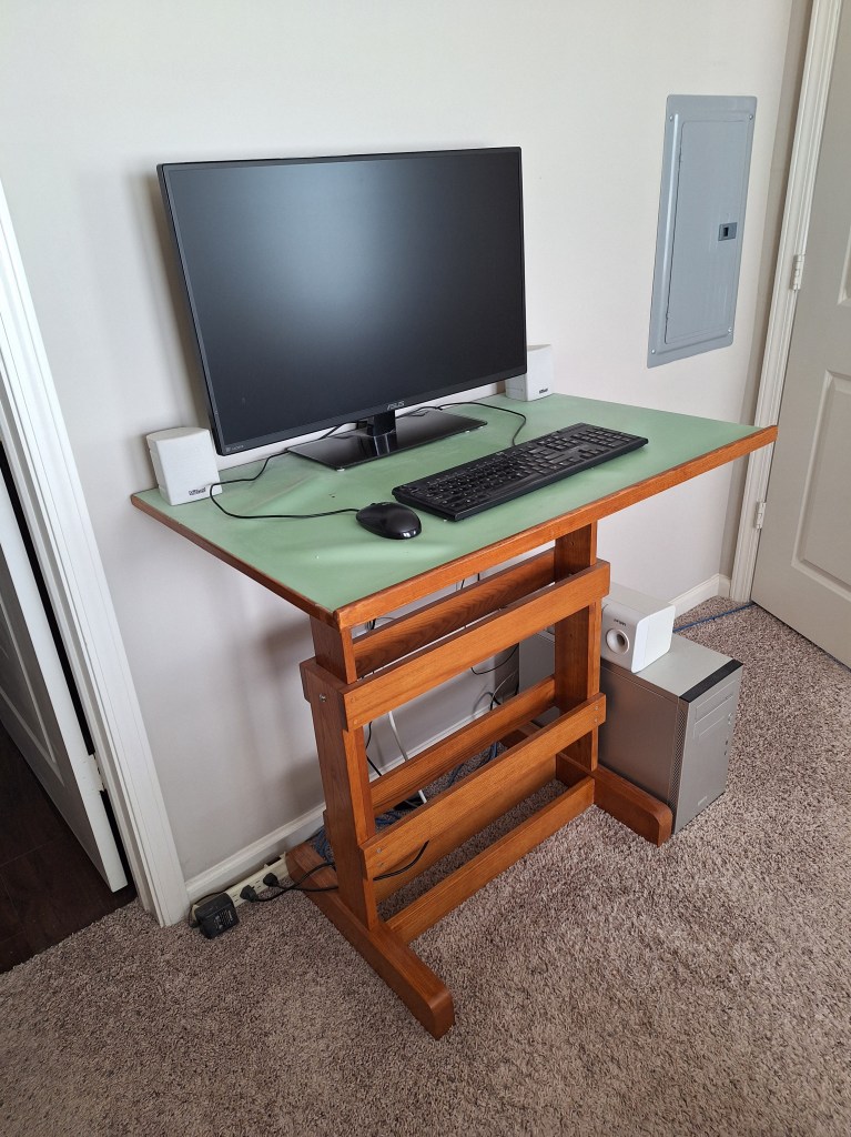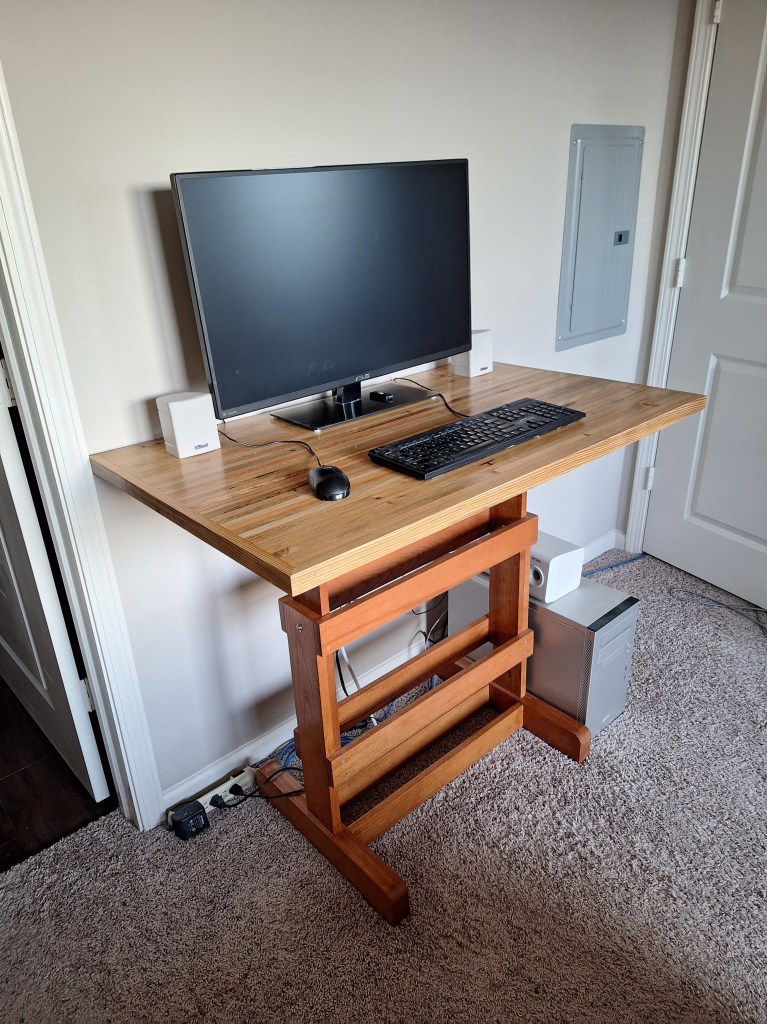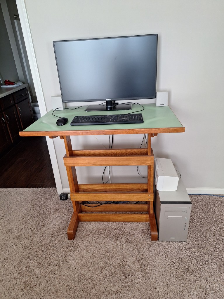 The top was made from particle board with a solid wood edging and covered with a thin green vinyl sheet. I currently use it to support my computer monitor and keyboard. It is sufficient, but the vinyl covering is not very flat anymore. In the image above you can see the “bubbled” areas by the mouse. I have managed with this, but is a bit of a nuisance. Here is another view from the front.