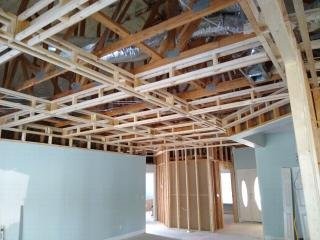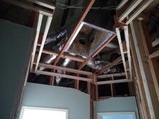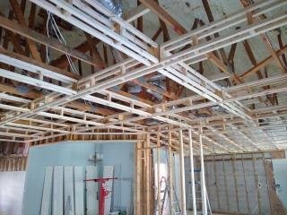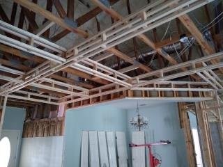 The tongue and groove (T&G) would need to be nailed to something that would be a consistent distance from the top of each coffer so that the distance from the T&G and the bottom of the coffer was consistent (we want a straight line all the way around). To achieve that I attached nailers to the top of the vertical boards as shown above, being careful to align them with the top of the board. I also added triangular nailers in all four corners. They are arranged diagonally so that the center is open for electrical stuff while still providing a surface for the T&G. These nailers were fastened to the vertical boards and I used a lot of shims when attaching to the joists. Below you can see how the T&G boards go up.