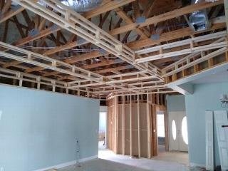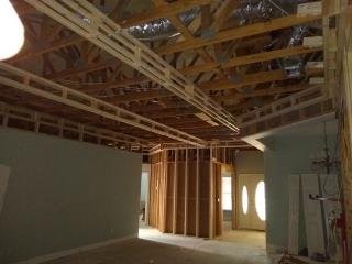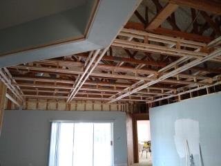 The next step in creating the coffered ceiling was to fill in the middle part. That will be done with pre-primed tongue and groove pine then finished with crown molding. When I framed the coffers, I tried to make sure they was square and level, requiring shims between the frames and the joists. So after the frames were wrapped, I had a pretty good reference surface to work from. That is, the top of the vertical boards served that purpose. The picture below will show you what I mean.