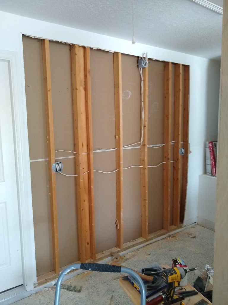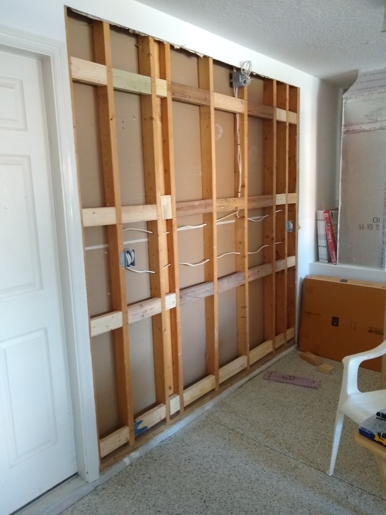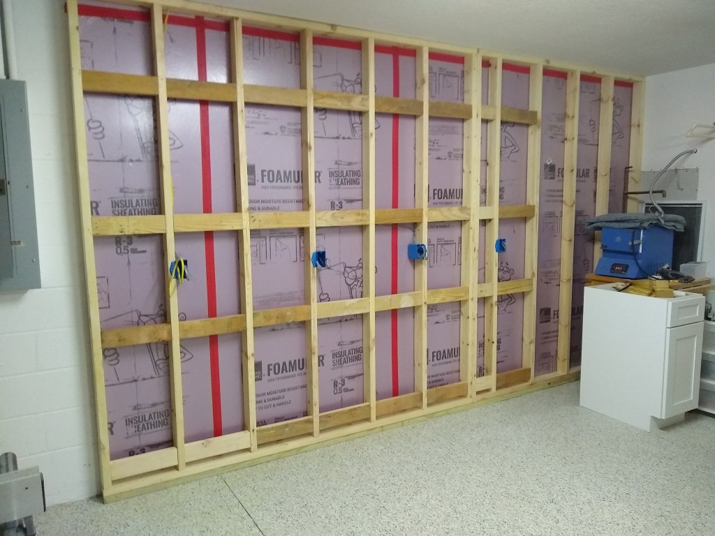 Eventually, I got fed up doing nothing and decided I had to start the next project. After the kitchen was done, I intended to turn my attention to the garage and setup a proper workshop, where I would be able to do the work needed to trim out the interior and, if adventurous enough, make the interior doors. This would be a big job, but one I could do in stages, so I decided to start by framing the west wall of the garage so I had a place to hang things and store long items. Here is what it looked like after I moved things out of the way.