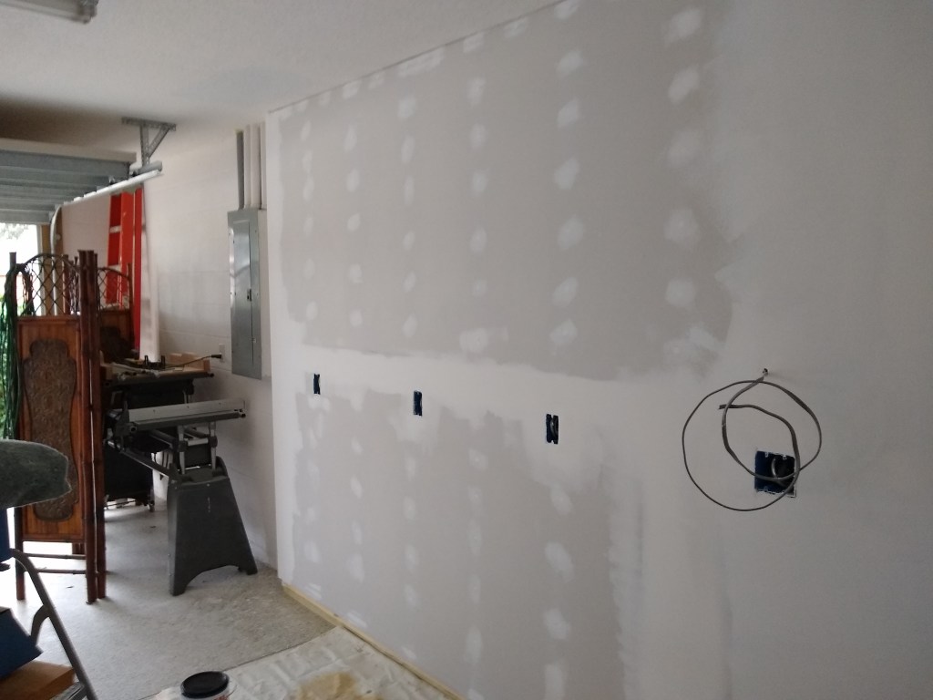 I had a similar setup in my other house, and it worked well, so I decided to duplicate it here. The high shelf allows me to store very long things up out of the way. With the horizontal boards, I have the freedom to add or move fixtures as needed. Here’s what I’ve added so far.