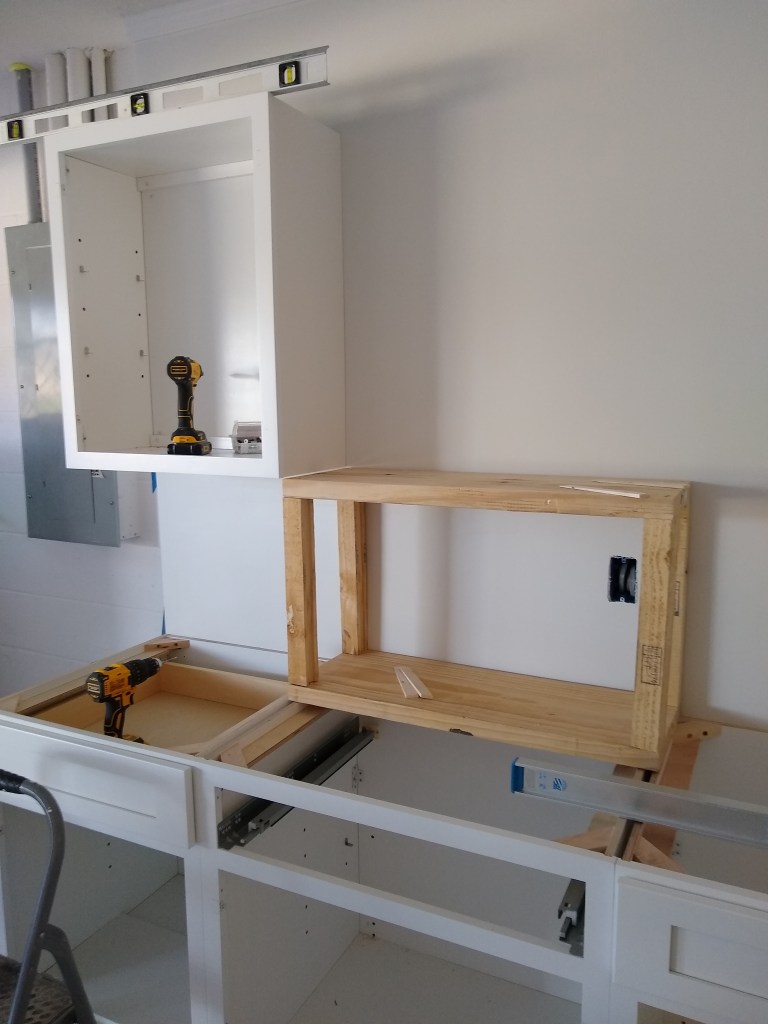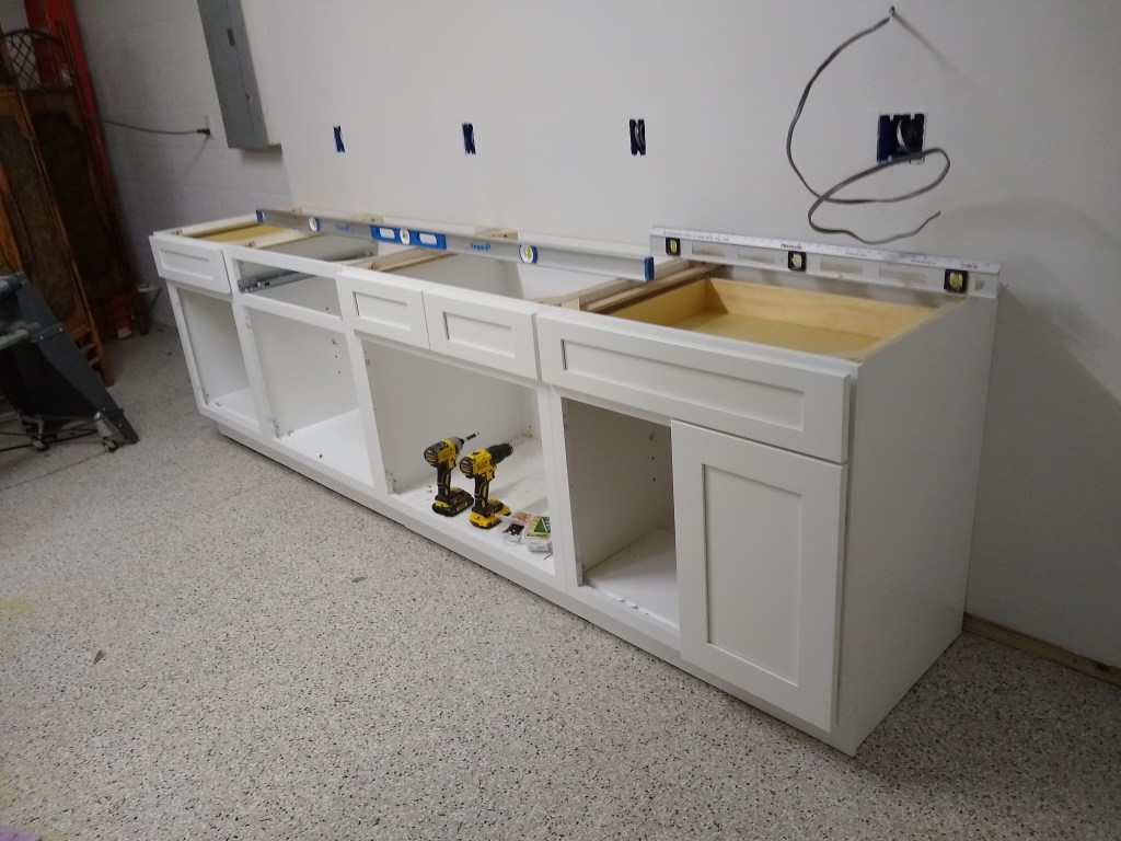 Returning to my work in the garage, after adding all the finishing coats to the butcher block countertops, I was ready to attach them to the base cabinets.